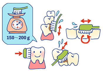 そのために大事なのは、1.毛先をキチンと歯の表面に当てる、2.歯ブラシを小刻みに動かす、3.軽い力(150~200g程度)磨くとなります。歯がはえている場所やはえ方によってそれぞれ見てみましょう。